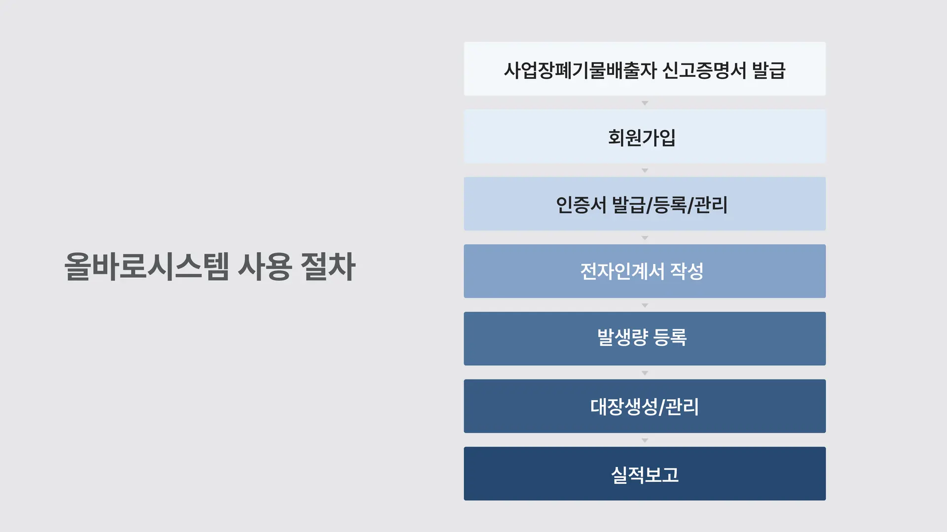 올바로 시스템 사용 절차는 폐기물 배출자 신고증명서 발급 → 회원가입 → 인증서 발급/등록/관리 → 전자인계서 작성 → 발생량 등록 → 대장생성/관리 → 실적보고 순으로 이루어져요.