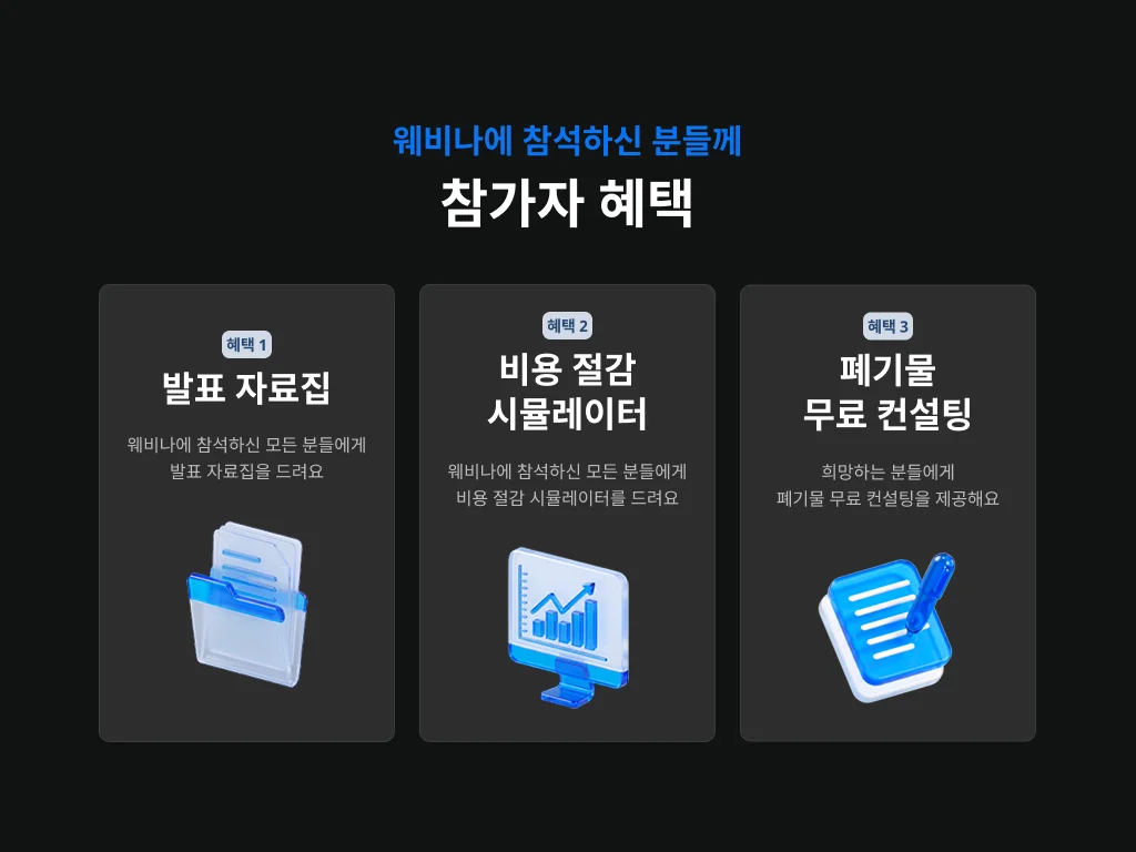 우리 회사의 숨은 비용을 찾아내고, 비용 개선 전략을 공유하는 [폐기물 처리 비용 최적화 웨비나]를 개최합니다. 이번 웨비나에서는 복잡한 폐기물 처리 비용 구조를 명쾌하게 분석하고, 즉시 적용 가능한 비용 절감 솔루션을 제시해 드립니다.